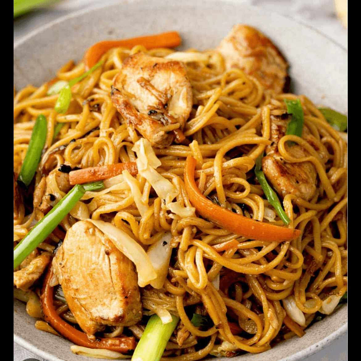 Stir-fried egg noodles with chicken, onion, garlic & ginger