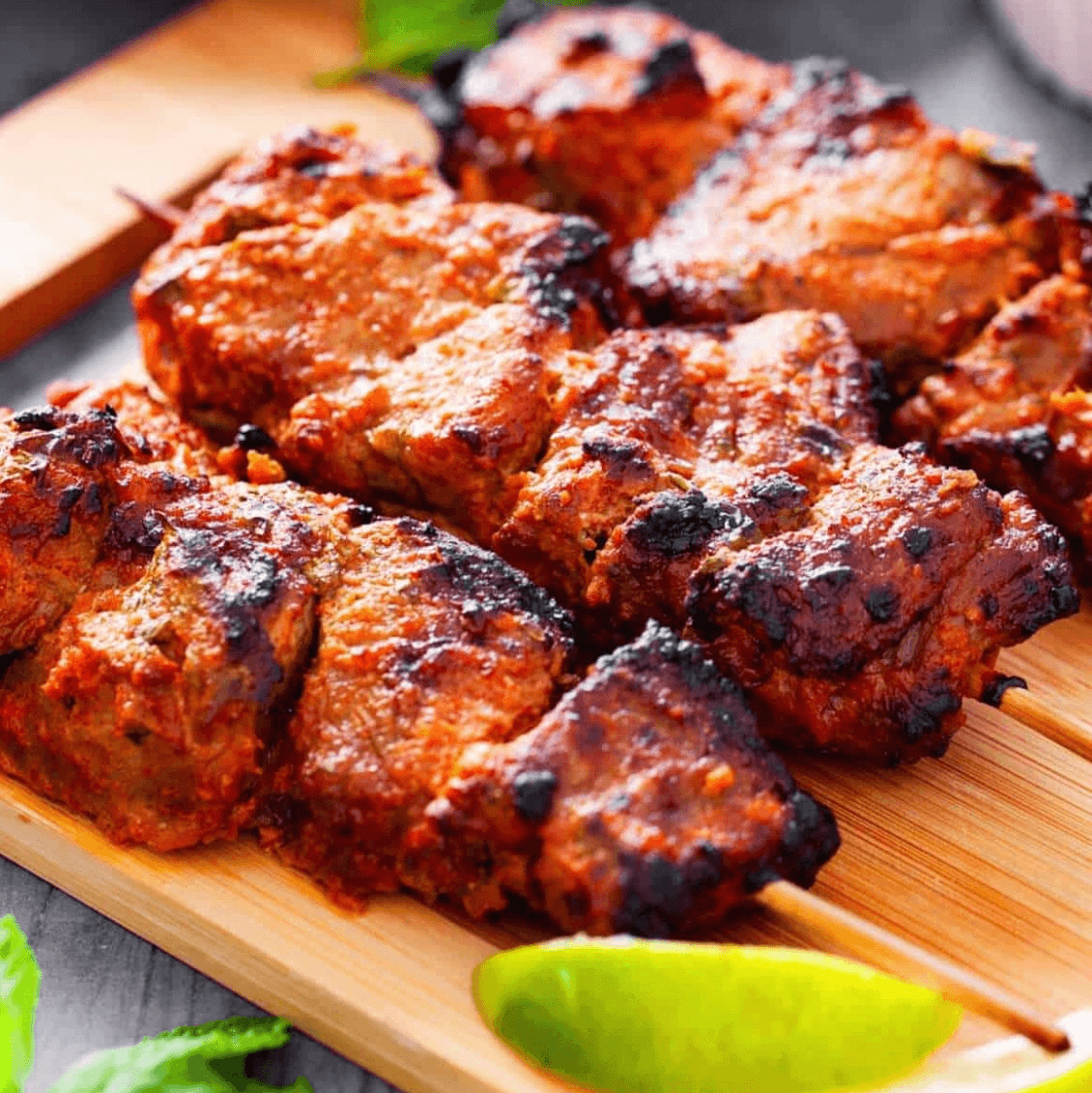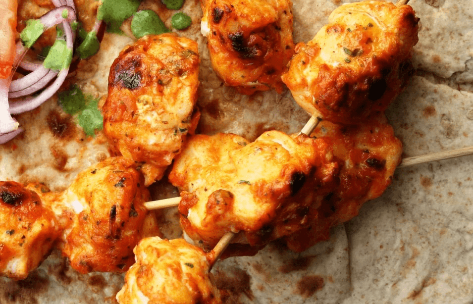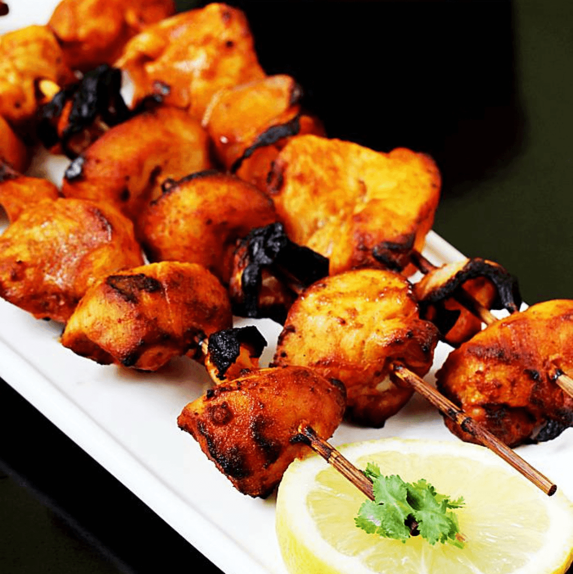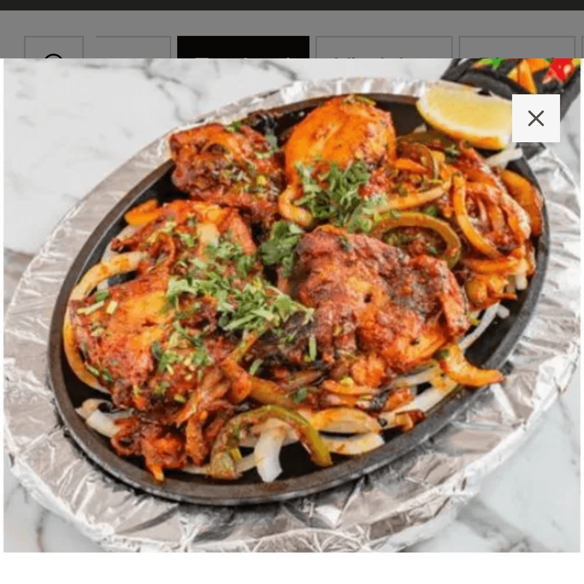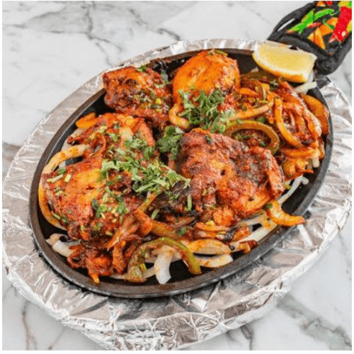 Chicken (with bone) marinated in yoghurt & spices, cooked in tandoor & served over bell peppers & onion bed in sizzler