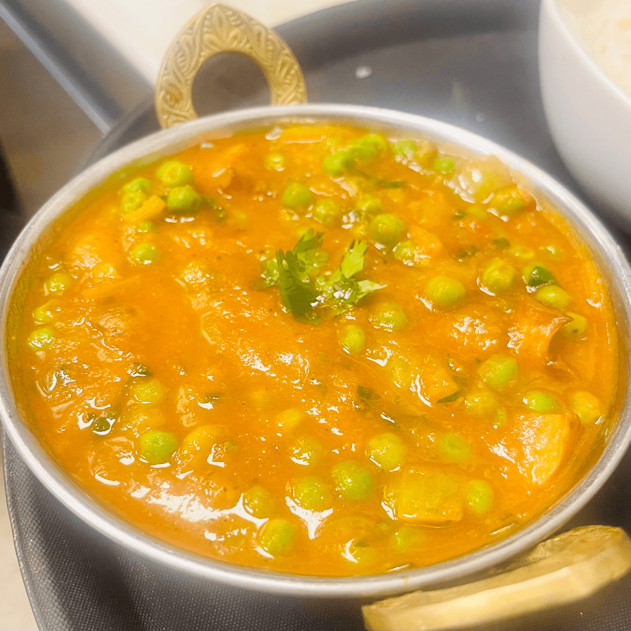 Eggplant & green peas cooked in spices & curry