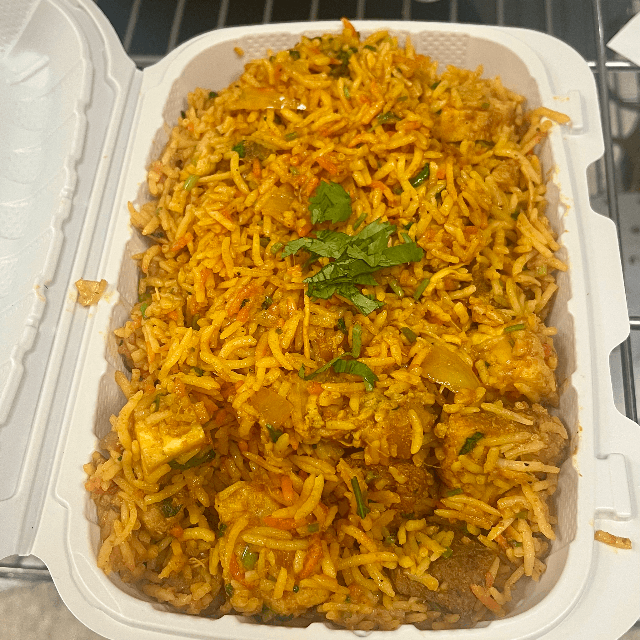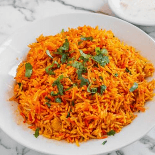 Fragrant Basmati rice from India, cooked with chicken. Delicately flavored and colored. It is a hearty main dish