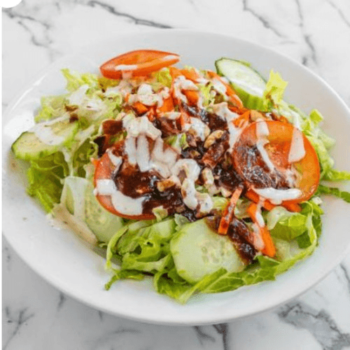 Lettuce, cucumber, tomato, onion, lime-squeezed/mild spiced, yoghurt dressing