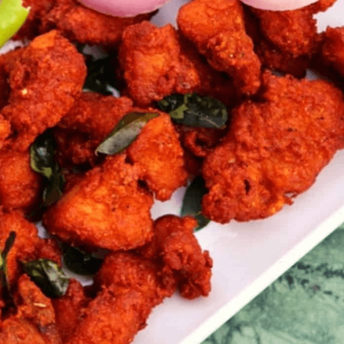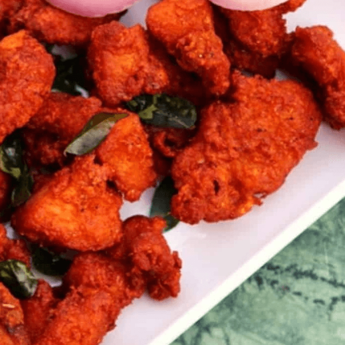 Deep-fried cauliflower marinated in Indian spices, batter made of chickpea flour (VF)