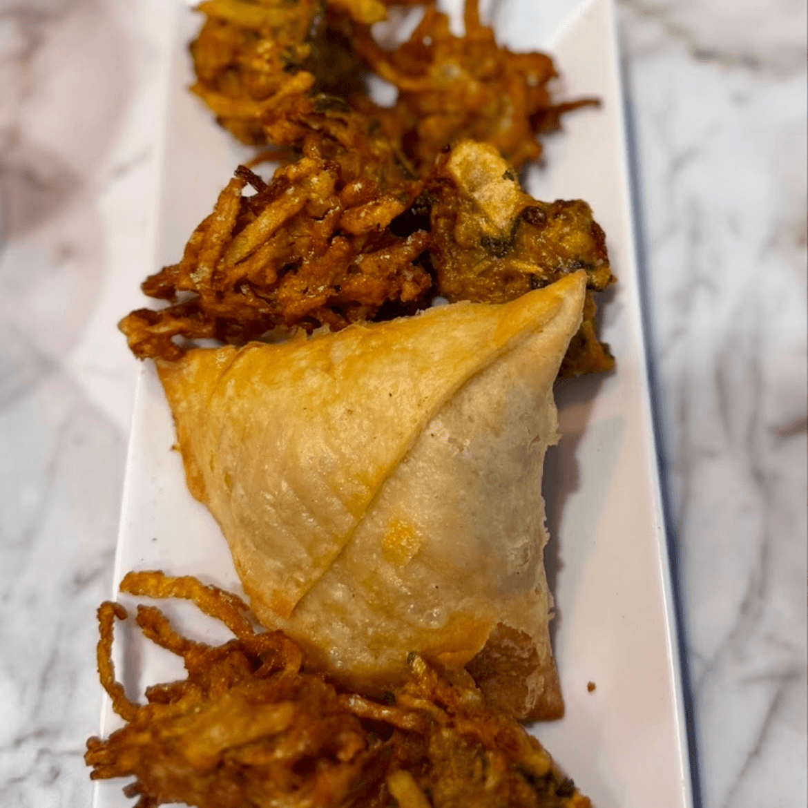 Assortment of samosa, pakoras, and onion bhaji with raita, mint chutney, and tamarind sauce