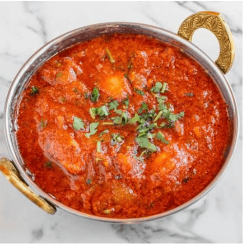 Braised chicken, fresh tomatoes, ginger, red chiles, turmeric, and garlic cooked in krahi