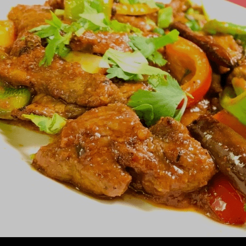 Boneless chicken fried and cooked in bell pepper and sauce