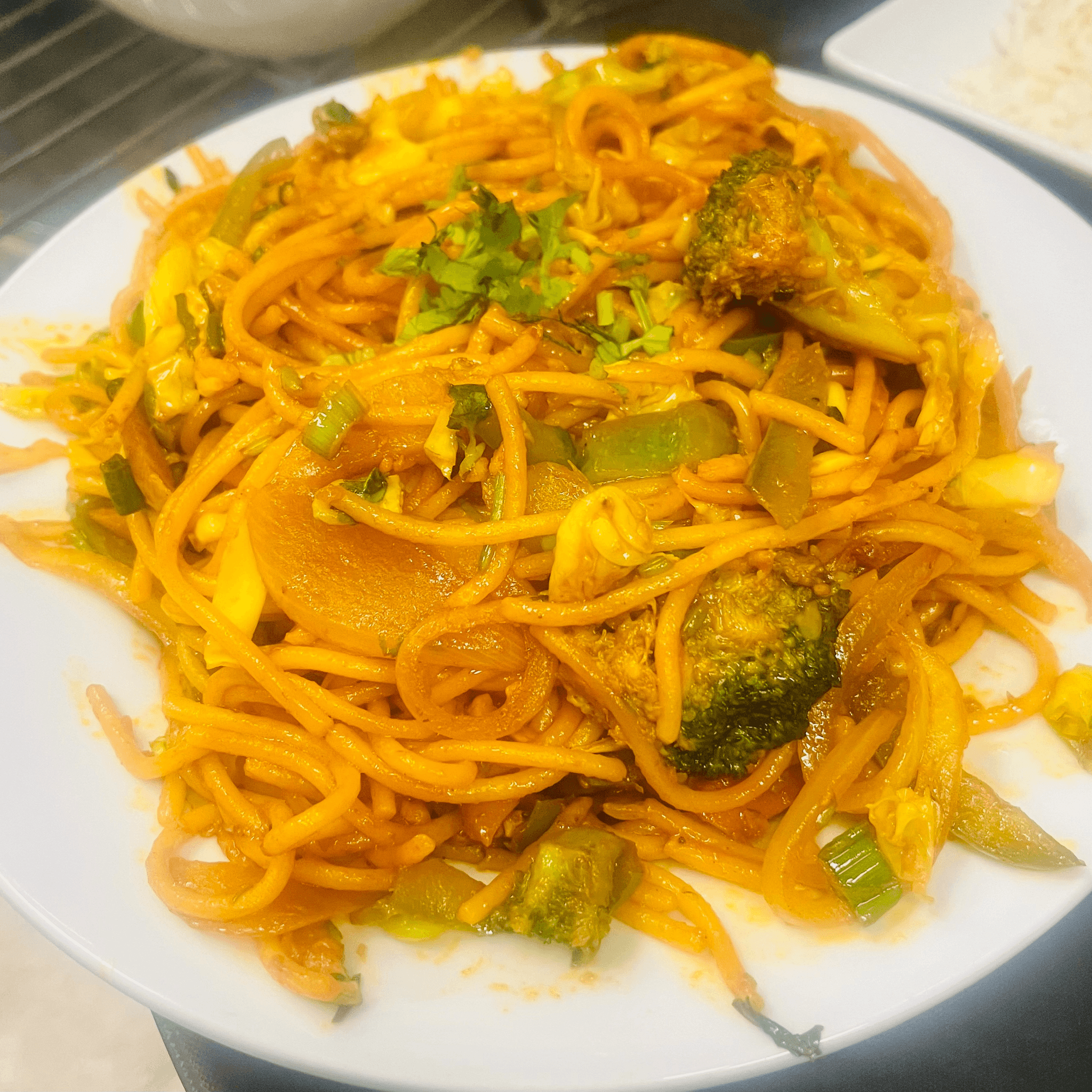 Stir-fried egg noodles with mixed vegetables, onion, garlic & ginger