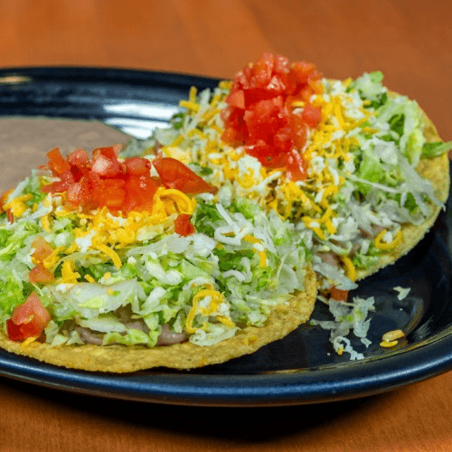 Two tostadas with your choice of bean, beef, beef and bean, shredded beef, chicken or guacamole. Served with beans and rice