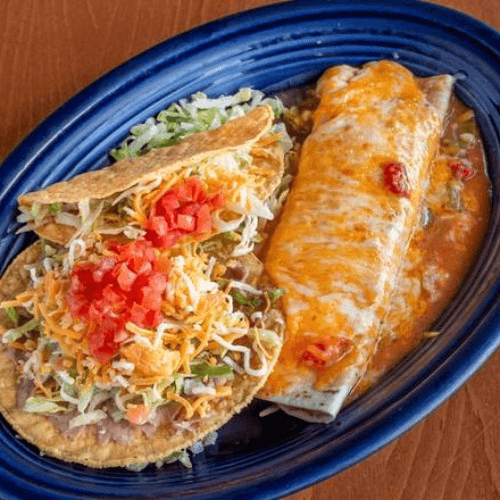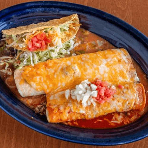 Two enchiladas with cheese, beef or chicken. Served with lettuce, tomatoes, onions, beans and rice