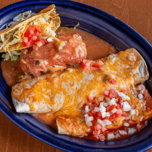 Large homemade tortilla stuffed with your choice beef, chicken or shredded beef, wrapped and fried. Smothered in green chile, topped with cheese and sour cream. Served with beans and rice