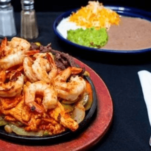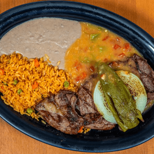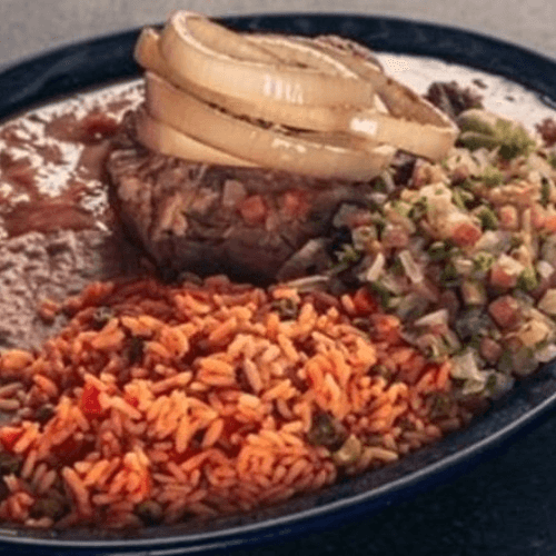 Grilled ribeye steak topped with grilled onions. Served with a grilled jalapeño, beans, rice and two flour tortillas