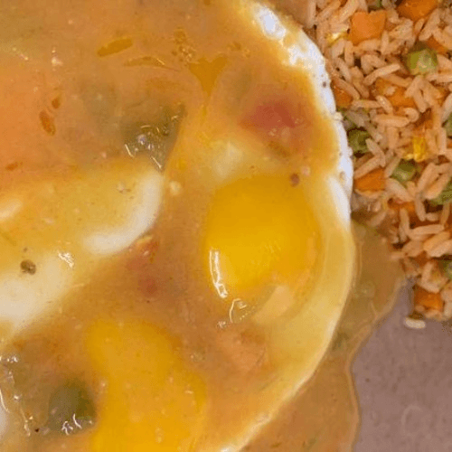 Two eggs any style, smothered in green chile. Served with beans, rice and two tortillas