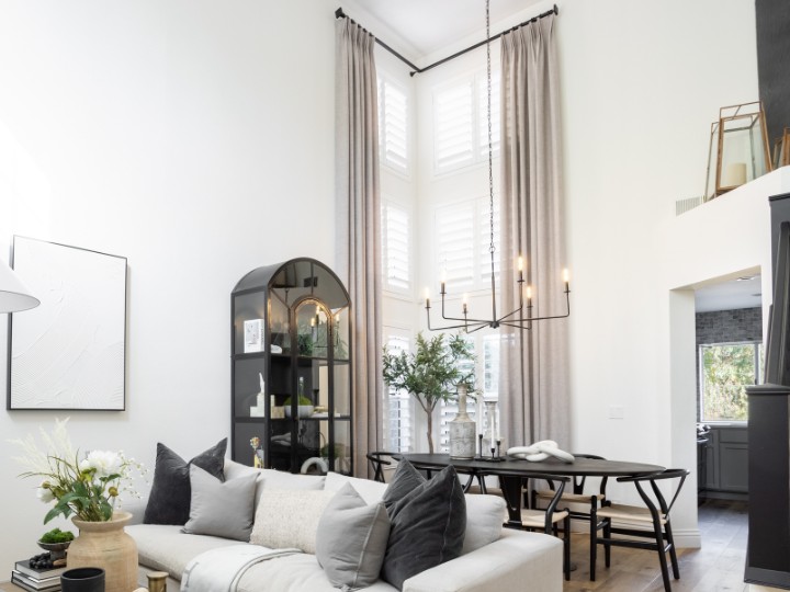 Wood Shutters paired with Drapery create a polished, layered look. The combination adds warmth, depth, and light control, making any space feel more refined. Contact Budget Blinds to learn more