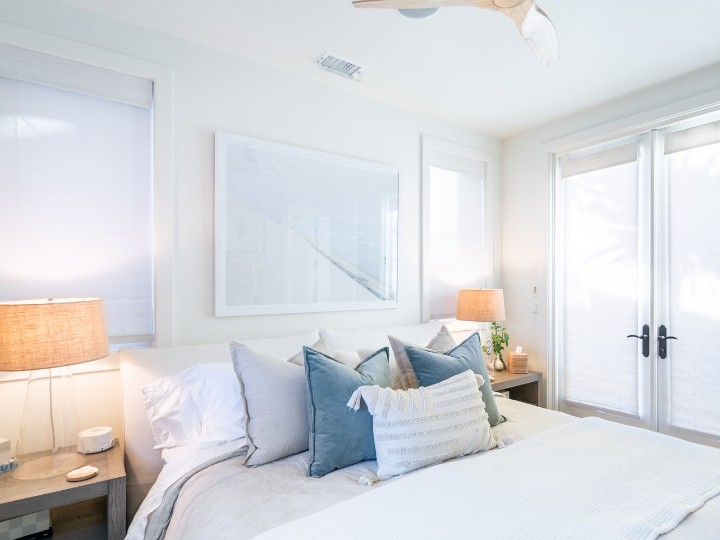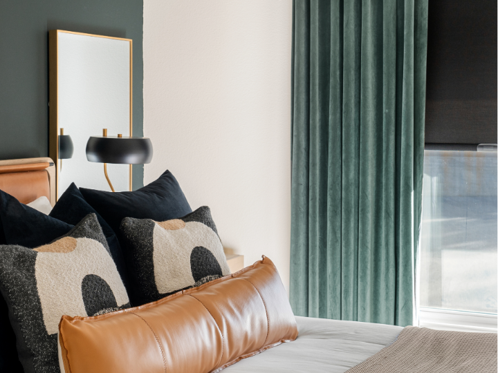 Create a serene, elevated bedroom with soft textures and effortless style. These roller shades combined with drapery by Vadain blend modern design with cozy sophistication
